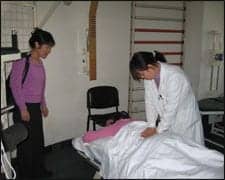 | Mei Zhao, PhD, MHA (co-author, left), translates as a University of North Florida student receives a massage from a Chinese therapist. Massage is part of the rehabilitation treatment plan, from stroke to orthopedic issues. |