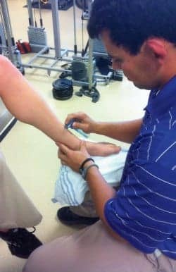 Dennis Romig, PT, treats a patient using an instrument-assisted soft tissue mobilization technique, which allows the weekend warrior to continue normal activities during treatment.
