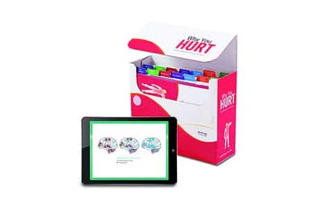 The Why You Hurt system, a valuable too for clinicians teaching their patients about pain, is composed of illustrated flashcards, discussion topics, teaching cues and homework sessions. It features 14 in-depth sections including “Pain Knowledge,” “Sensitive Nerves,” “Emotions and Pain,” and more.