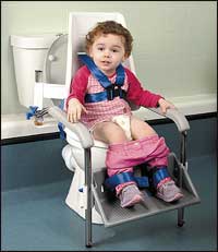 A potty chair may be needed for children with poor postural control. Models are available with headrests, high trunk support, low trunk support, adductor pads (leg separators), splash guards (for boys), thigh supports, and/or footrests. The child needs to relax in order for the necessary sphincters to open. The first step is to stabilize the pelvis while allowing an open space in the right place. Supporting the thigh bones (femurs) is essential. Next, determine if your child voids best with hip flexion or extension. Many potty chairs position the child in a reclined position, not necessarily the ideal position for voiding. Most people prefer a forward leaning position with a closed hip angle. Firm foot support with mild to moderate knee flexion also seems to help. Sometimes a grab bar can be helpful for you to stabilize yourself, or for the child to do so as well.